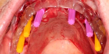 Multi-Unit Abutments: Once the implants are placed, angled abutments (Multi-Unit Abutments) are screwed onto the implants. These correct the angle of the tilted implants, making them parallel so the prosthesis can sit flat and passive.